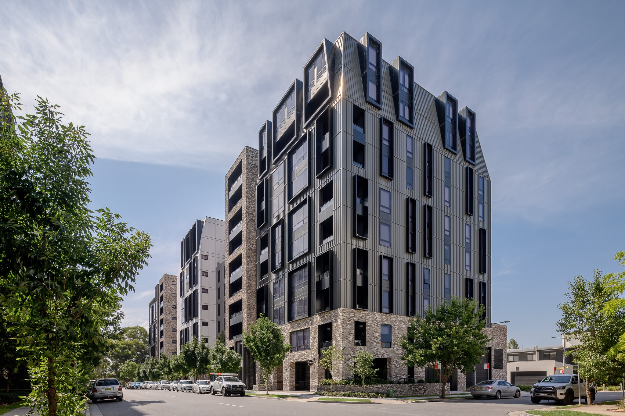 Designed and crafted by COX Architects. Each living space features elegant timber flooring, adding a warm and natural elegance to the heart of each new residence. Vibrant green features are integrated throughout the space to reflect the lush local scenery, and large sliding balcony doors open to spacious outdoor areas, offering breathtaking views that stretch from the vibrant local landscapes to the Blue Mountains.