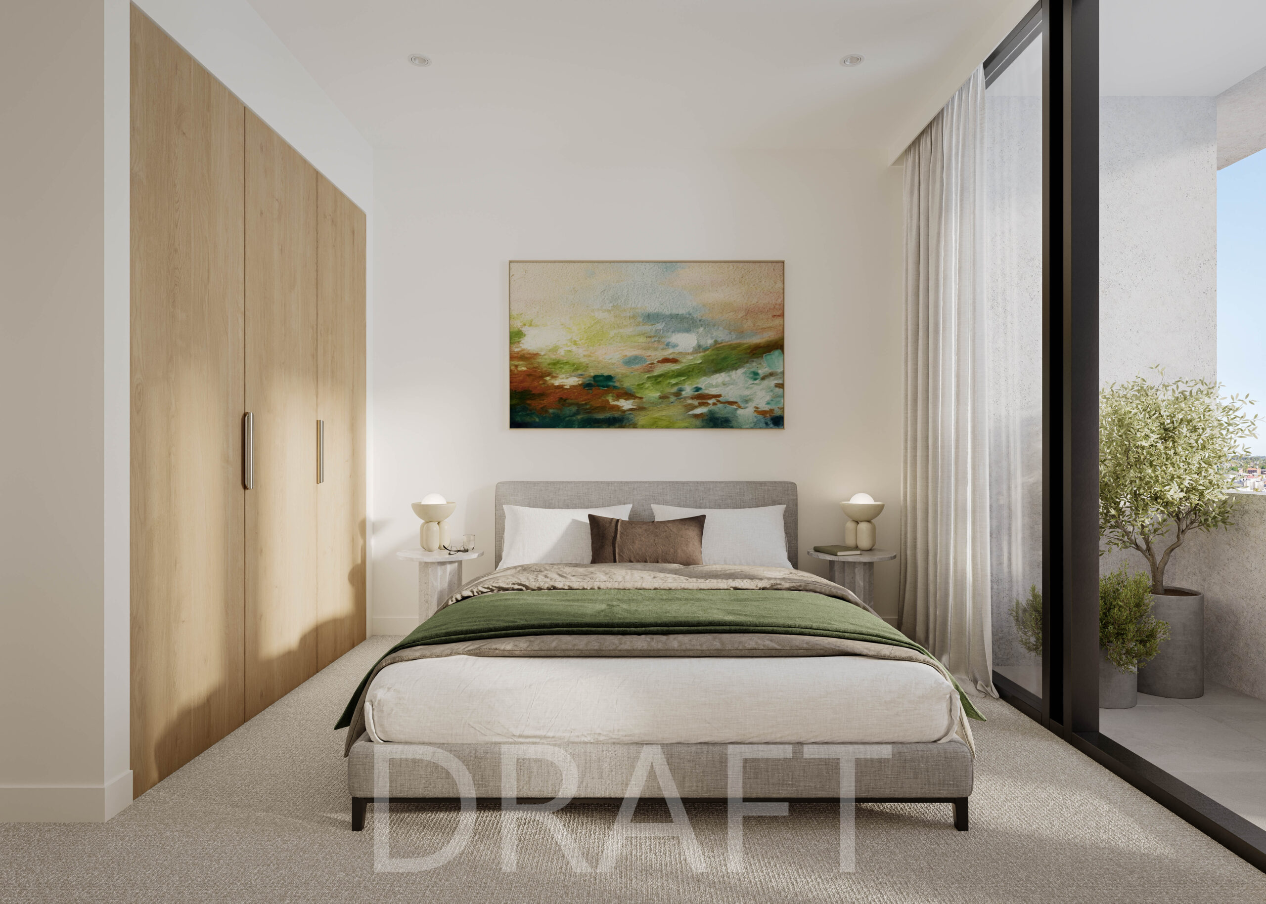 Soft hues and natural materials reflect the sunlight that filters through the sliding glass balcony doors, which double as floor-to-ceiling windows. The wooden wardrobe adds a touch of earthiness and warmth, providing ample storage to maintain a clutter-free space. Plush carpet cushions every step, creating a tranquil retreat for relaxation and rejuvenation.